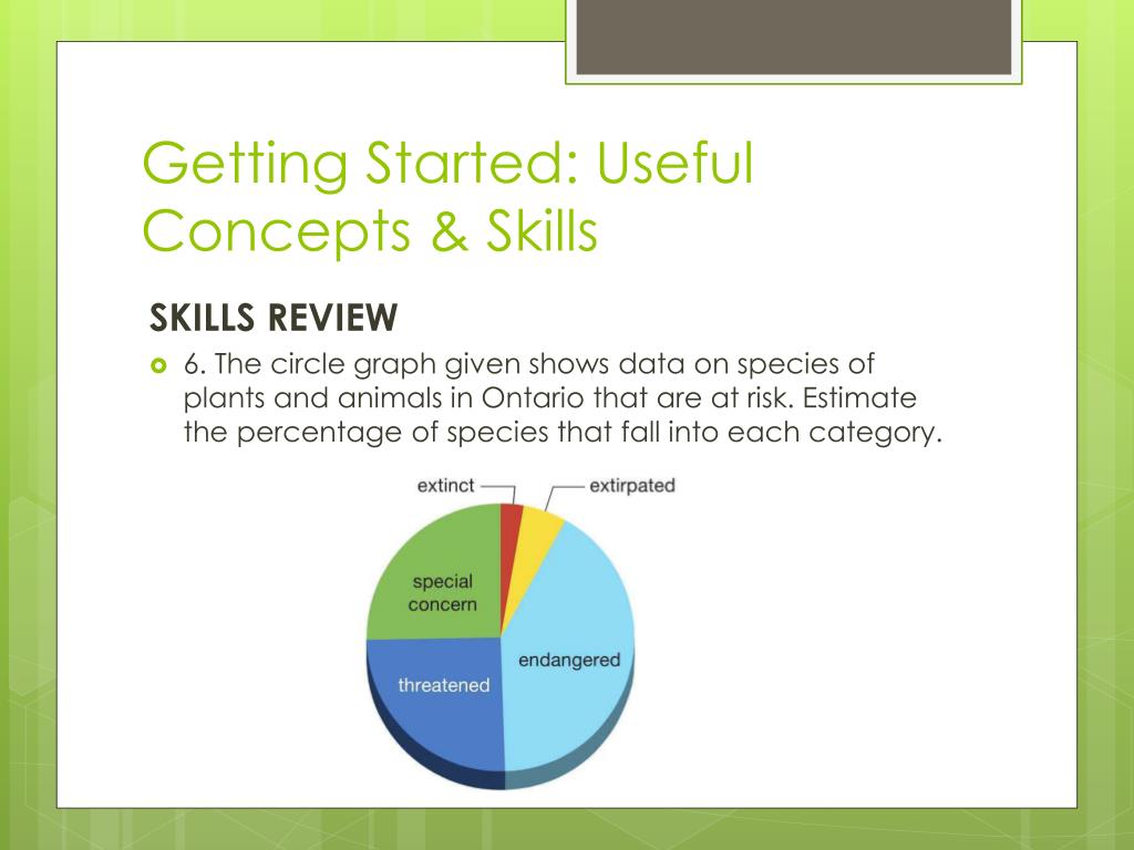 Getting Started: Useful Concepts & Skills SKILLS REVIEW • 6. The circle graph given shows data on species of plants and animals in Ontario that are at risk. Estimate the percentage of species that fall intoeachcategory.