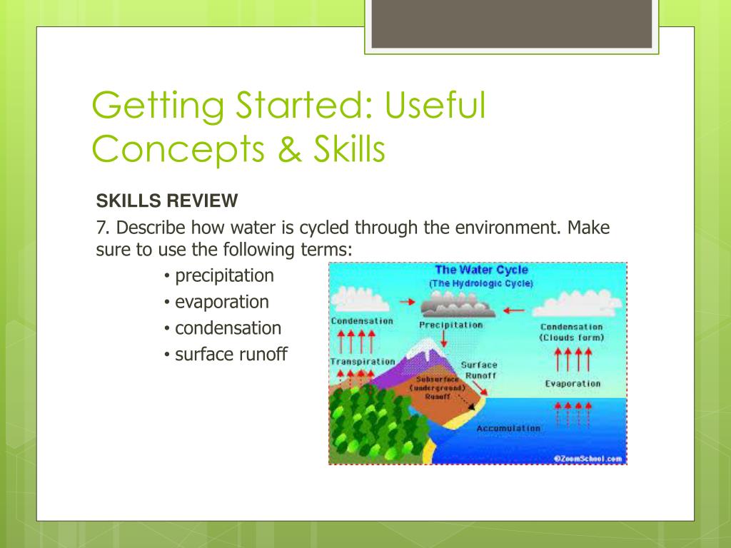 Getting Started: Useful Concepts & Skills SKILLS REVIEW 7. Describe how water is cycled through the environment. Make sure to use the followingterms: • precipitation • evaporation • condensation • surface runoff