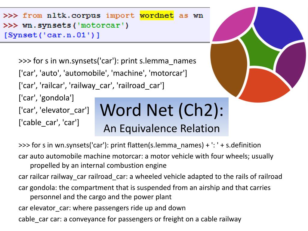 Word Net (Ch2):An Equivalence Relation >>> for s in wn.synsets('car'): print s.lemma_names ['car', 'auto', 'automobile', 'machine', 'motorcar'] ['car', 'railcar', 'railway_car', 'railroad_car'] ['car', 'gondola'] ['car', 'elevator_car'] ['cable_car', 'car'] >>> for s in wn.synsets('car'): print flatten(s.lemma_names) + ': ' + s.definition car auto automobile machine motorcar: a motor vehicle with four wheels; usually propelled by an internal combustion engine car railcar railway_carrailroad_car: a wheeled vehicle adapted to the rails of railroad car gondola: the compartment that is suspended from an airship and that carries personnel and the cargo and the power plant car elevator_car: where passengers ride up and down cable_car car: a conveyance for passengers or freight on a cable railway