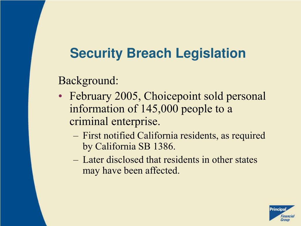 Security Breach Legislation Background: • February 2005, Choicepoint sold personal information of 145,000 people to a criminal enterprise. • First notified California residents, as required by California SB 1386. • Later disclosed that residents in other states may have been affected.