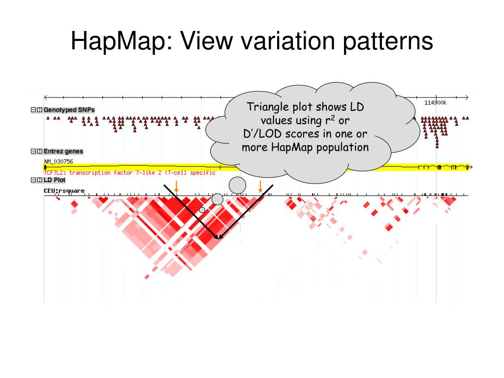 HapMap: View variation patterns Triangle plot shows LD values using r2 or D’/LOD scores in one or more HapMap population