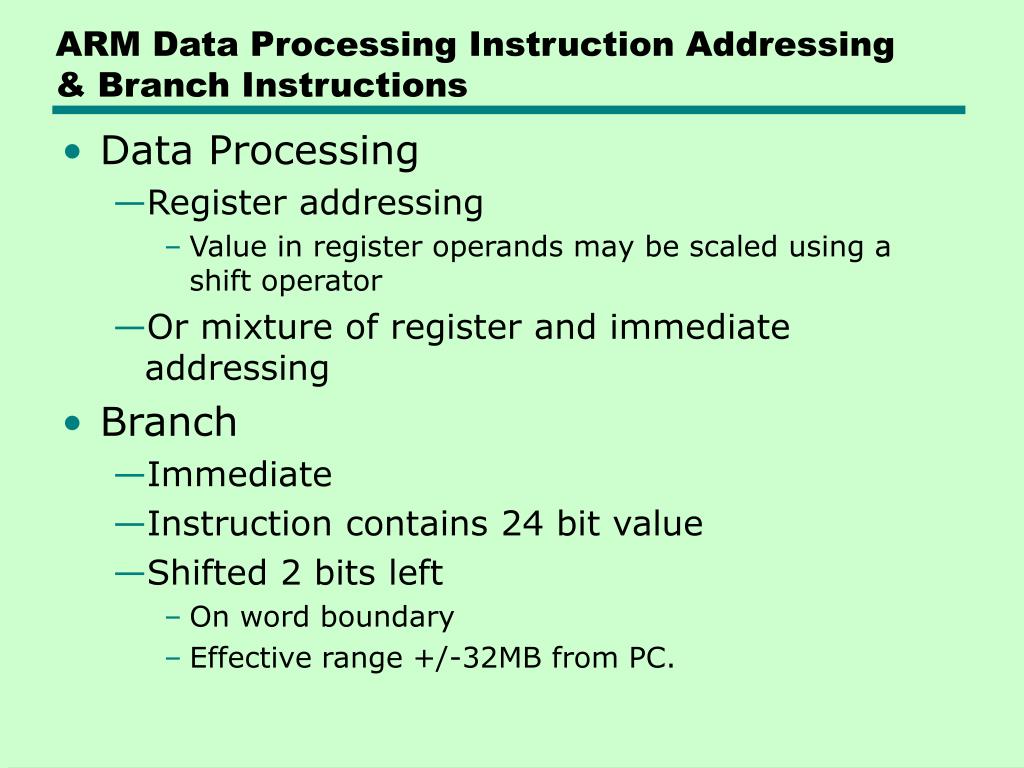 ARM Data Processing Instruction Addressing& Branch Instructions • Data Processing • Register addressing • Value in register operands may be scaled using a shift operator • Or mixture of register and immediate addressing • Branch • Immediate • Instruction contains 24 bit value • Shifted 2 bits left • On word boundary • Effective range +/-32MB from PC.