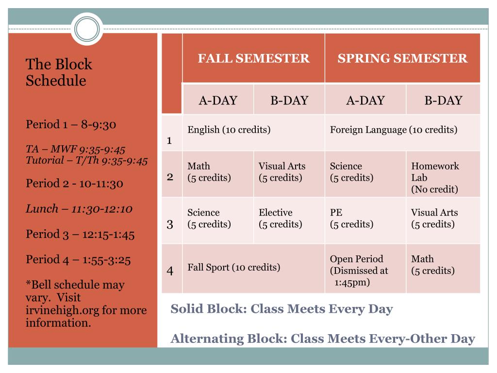 The Block Schedule Period 1 – 8-9:30 TA – MWF 9:35-9:45 Tutorial – T/Th 9:35-9:45 Period 2 - 10-11:30 Lunch – 11:30-12:10 Period 3 – 12:15-1:45 Period 4 – 1:55-3:25 *Bell schedule may vary. Visit irvinehigh.org for more information. Solid Block: Class Meets Every DayAlternating Block: Class Meets Every-Other Day