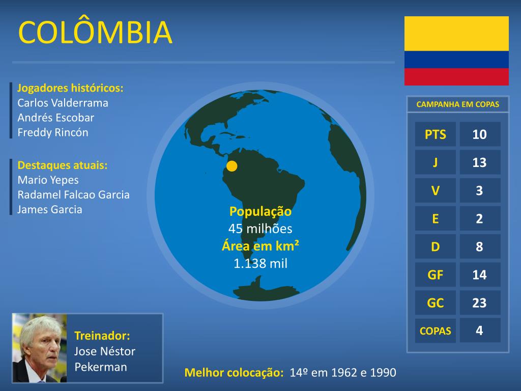 COLÔMBIA Jogadores históricos: Carlos Valderrama Andrés Escobar Freddy Rincón CAMPANHA EM COPAS PTS 10 13 J Destaques atuais: Mario Yepes Radamel Falcao Garcia James Garcia 3 V 2 E População 45 milhões Área em km² 1.138 mil 8 D 14 GF 23 GC 4 COPAS Treinador: Jose Néstor Pekerman Melhor colocação: 14º em 1962 e 1990