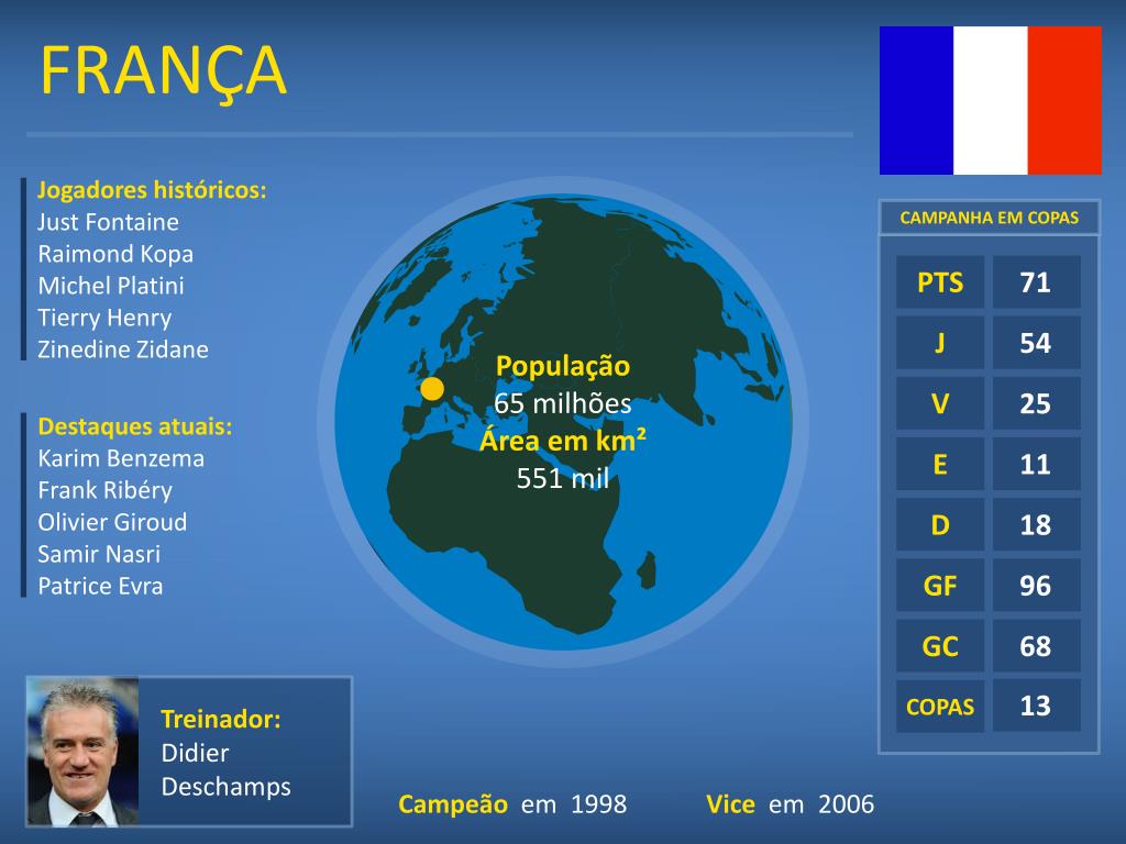 FRANÇA Jogadores históricos: Just Fontaine Raimond Kopa Michel Platini Tierry Henry Zinedine Zidane CAMPANHA EM COPAS PTS 71 54 J População 65 milhões Área em km² 551 mil 25 V 11 Destaques atuais: Karim Benzema Frank Ribéry Olivier Giroud Samir Nasri Patrice Evra E 18 D 96 GF 68 GC 13 COPAS Treinador: Didier Deschamps Campeão em 1998 Vice em 2006