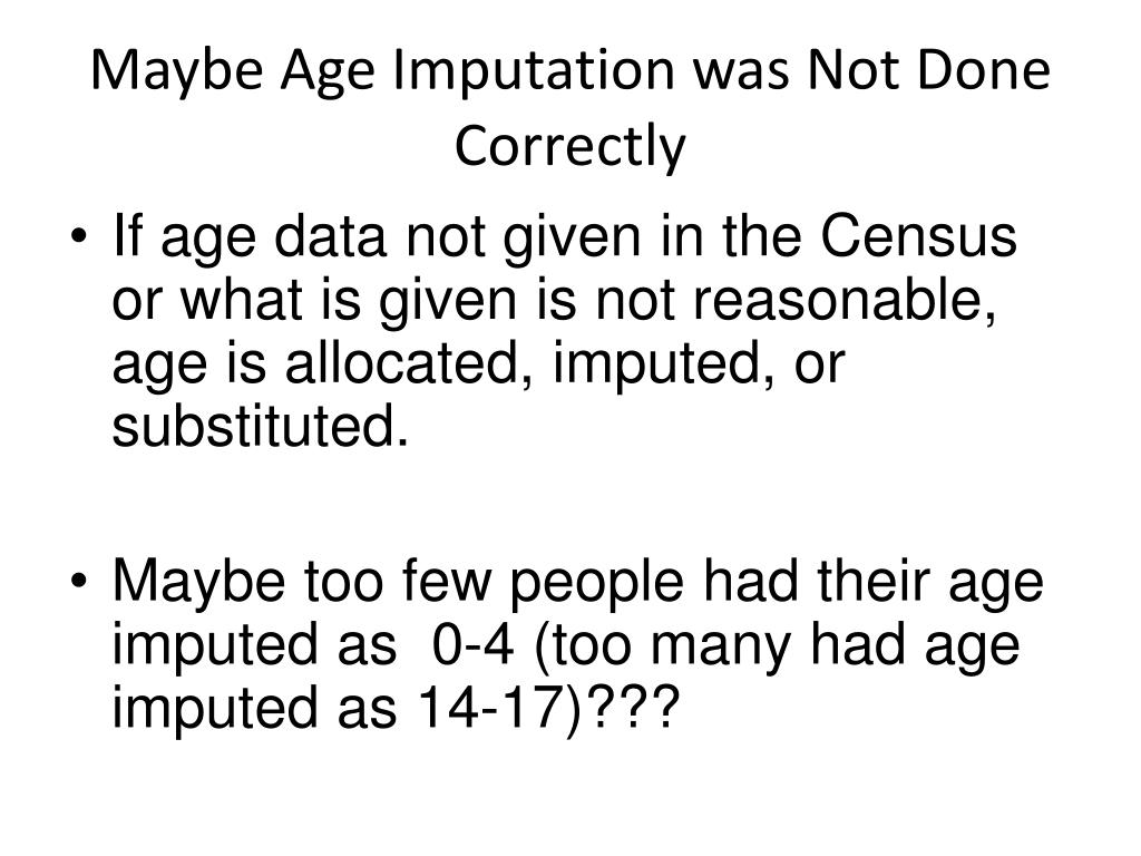 Maybe Age Imputation was Not Done Correctly • If age data not given in the Census or what is given is not reasonable, age is allocated, imputed, or substituted. • Maybe too few people had their age imputed as 0-4 (too many had age imputed as 14-17)???