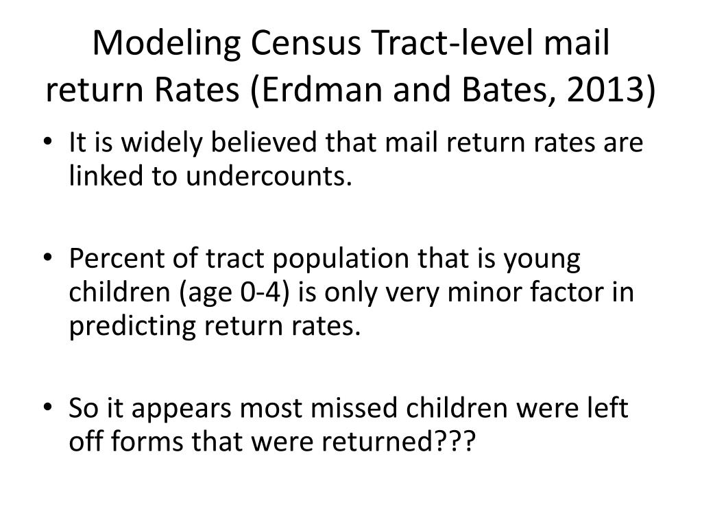 Modeling Census Tract-level mail return Rates (Erdman and Bates, 2013) • It is widely believed that mail return rates are linked to undercounts. • Percent of tract population that is young children (age 0-4) is only very minor factor in predicting return rates. • So it appears most missed children were left off forms that were returned???