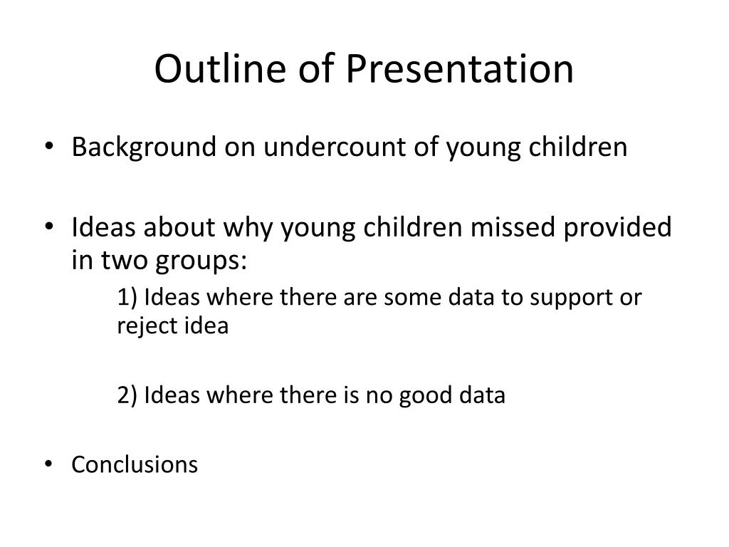 Outline of Presentation • Background on undercount of young children • Ideas about why young children missed provided in two groups: 1) Ideas where there are some data to support or reject idea 2) Ideas where there is no good data • Conclusions
