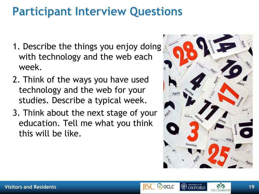 Participant Interview Questions 1. Describe the things you enjoy doing with technology and the web each week. 2. Think of the ways you have used technology and the web for your studies. Describe a typical week. 3. Think about the next stage of your education. Tell me what you think this will be like.