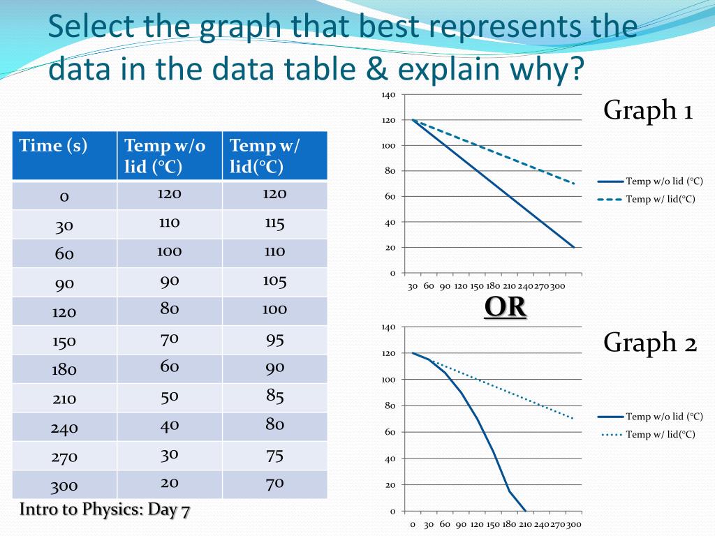 Select the graph that best represents the data in the data table & explain why? Graph 1 OR Graph 2 Intro to Physics: Day 7