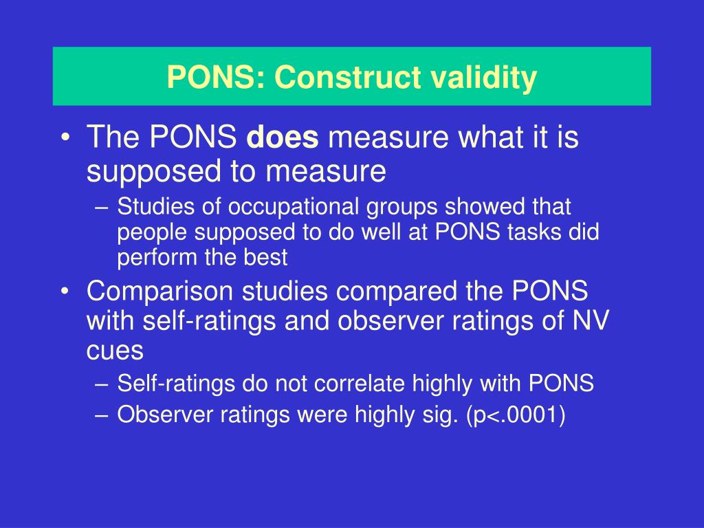 PONS: Construct validity • The PONS does measure what it is supposed to measure • Studies of occupational groups showed that people supposed to do well at PONS tasks did perform the best • Comparison studies compared the PONS with self-ratings and observer ratings of NV cues • Self-ratings do not correlate highly with PONS • Observer ratings were highly sig. (p<.0001)
