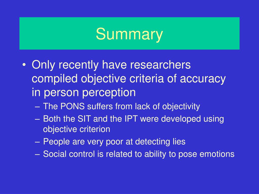 Summary • Only recently have researchers compiled objective criteria of accuracy in person perception • The PONS suffers from lack of objectivity • Both the SIT and the IPT were developed using objective criterion • People are very poor at detecting lies • Social control is related to ability to pose emotions
