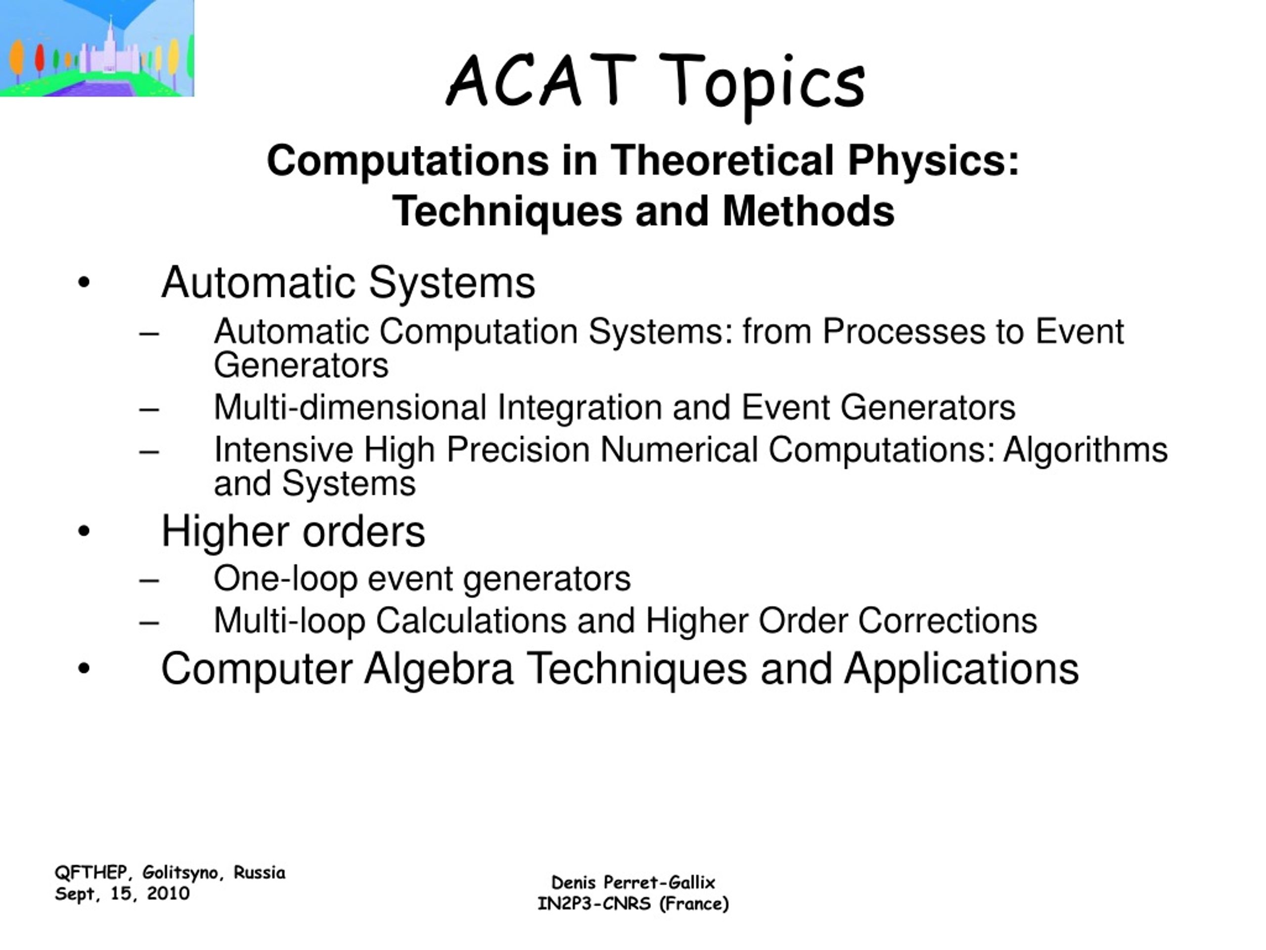 Automatic Systems Automatic Computation Systems: from Processes to Event Generators Multi-dimensional Integration and Event Generators Intensive High Precision Numerical Computations: Algorithms and Systems Higher orders One-loop event generators Multi-loop Calculations and Higher Order Corrections Computer Algebra Techniques and Applications ACAT Topics Computations in Theoretical Physics: Techniques and Methods Denis Perret-Gallix IN2P3-CNRS (France)