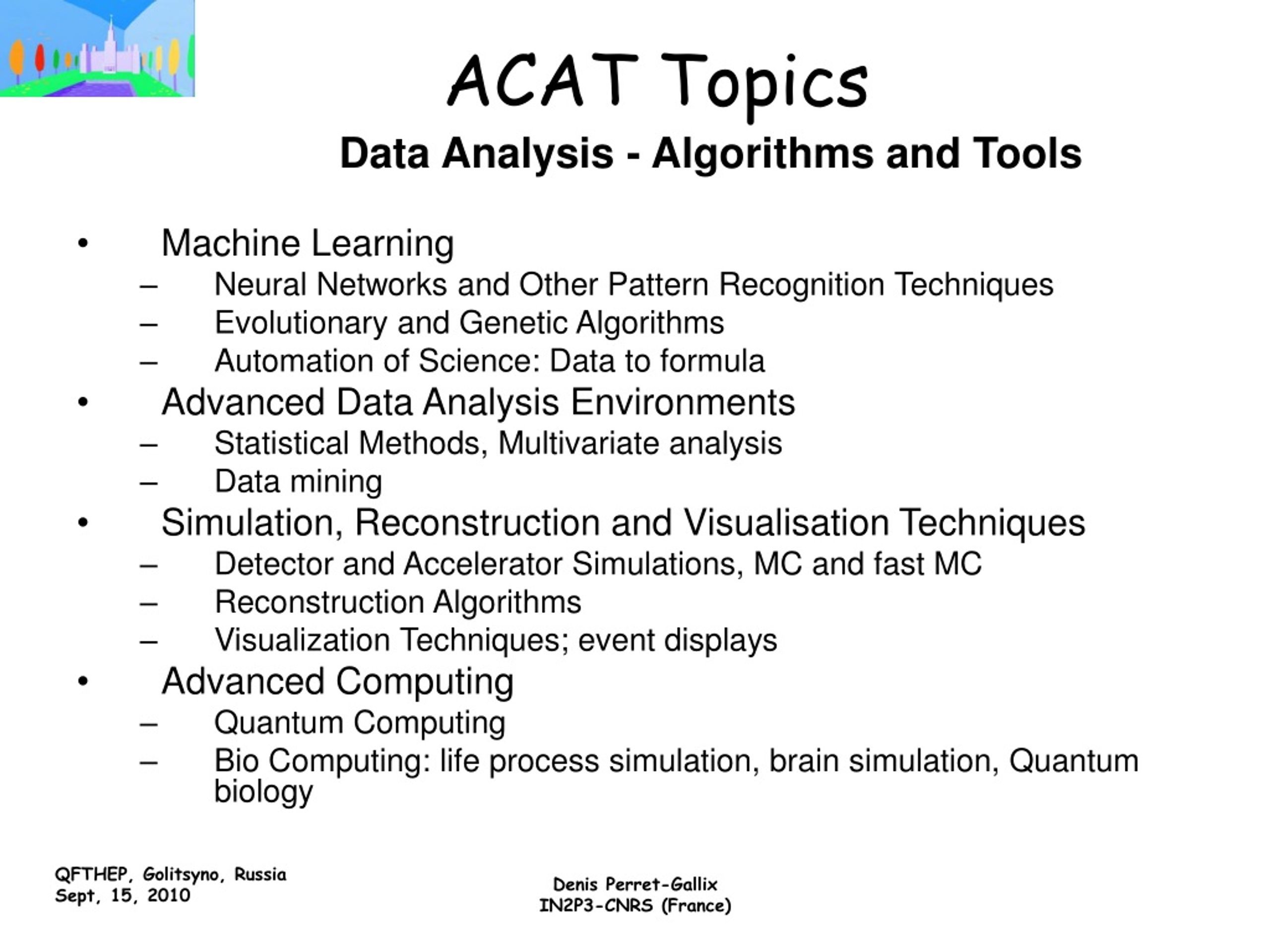 Machine Learning Neural Networks and Other Pattern Recognition Techniques Evolutionary and Genetic Algorithms Automation of Science: Data to formula Advanced Data Analysis Environments Statistical Methods, Multivariate analysis Data mining Simulation, Reconstruction and Visualisation Techniques Detector and Accelerator Simulations, MC and fast MC Reconstruction Algorithms Visualization Techniques; event displays Advanced Computing Quantum Computing Bio Computing: life process simulation, brain simulation, Quantum biology ACAT Topics Data Analysis - Algorithms and Tools Denis Perret-Gallix IN2P3-CNRS (France)