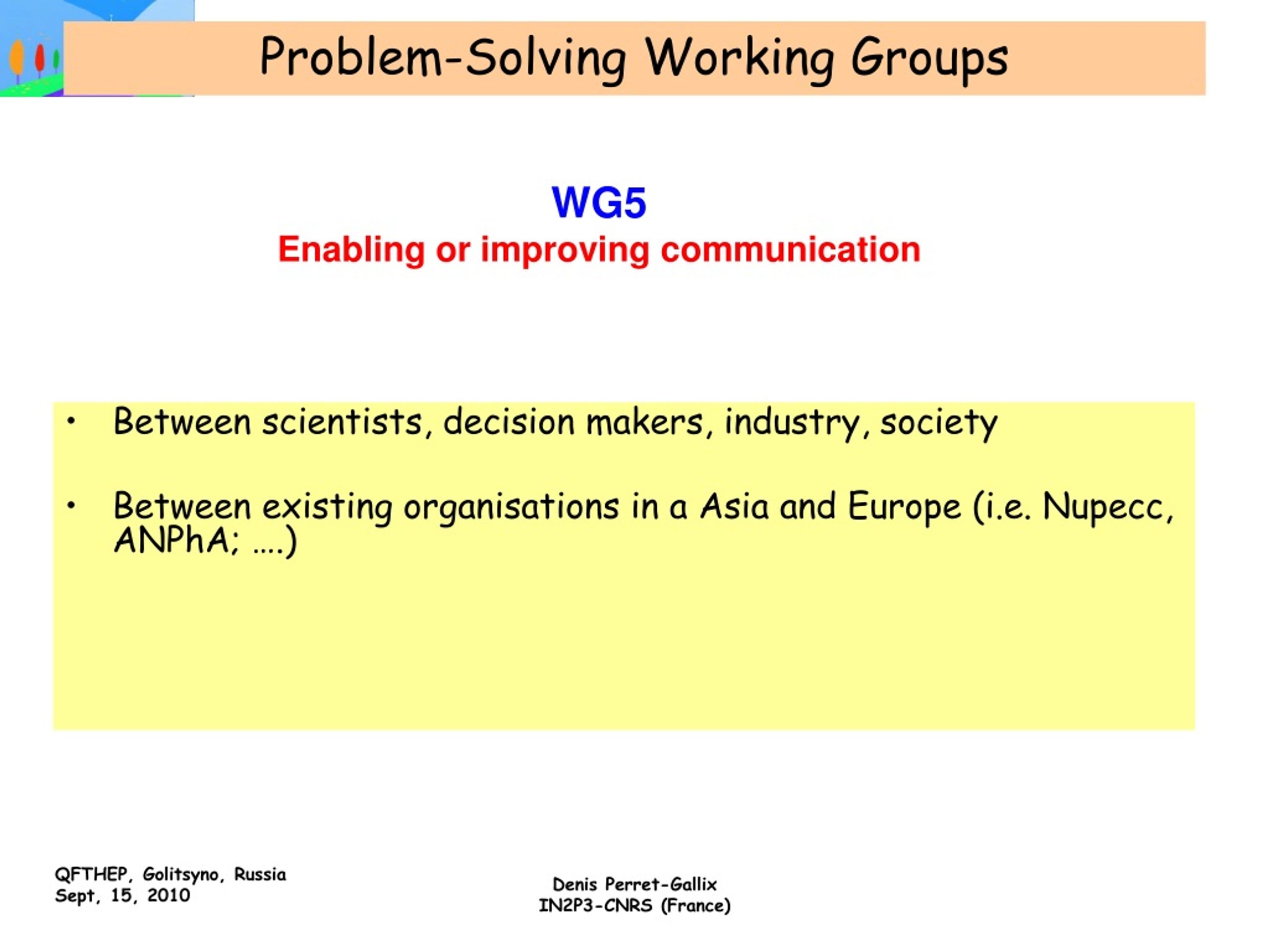 Between scientists, decision makers, industry, society Between existing organisations in a Asia and Europe (i.e. Nupecc, ANPhA; ….) Problem-Solving Working Groups WG5 Enabling or improving communication Denis Perret-Gallix IN2P3-CNRS (France)