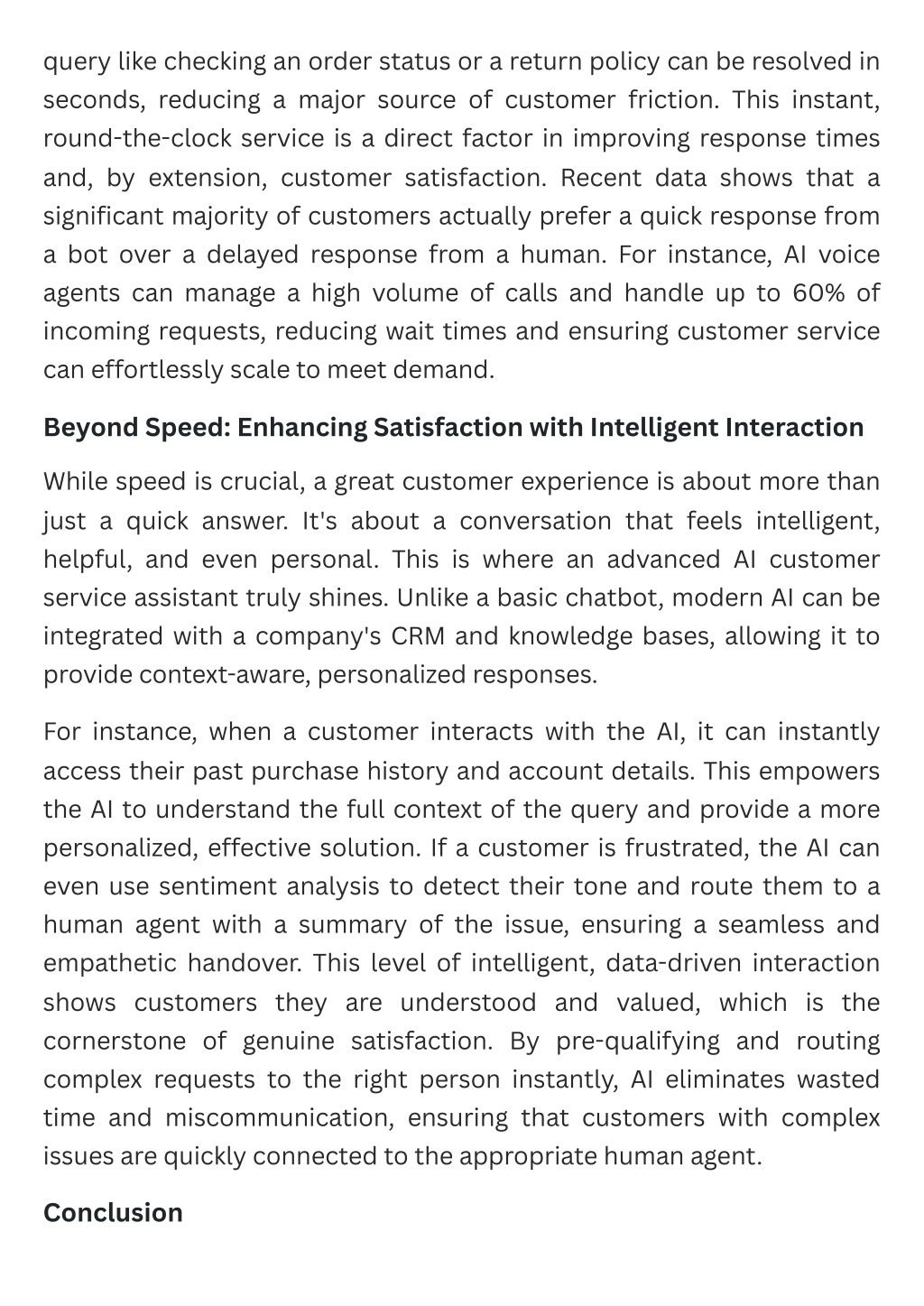 query like checking an order status or a return policy can be resolved in seconds, reducing a major source of customer friction. This instant, round-the-clock service is a direct factor in improving response times and, by extension, customer satisfaction. Recent data shows that a significant majority of customers actually prefer a quick response from a bot over a delayed response from a human. For instance, AI voice agents can manage a high volume of calls and handle up to 60% of incoming requests, reducing wait times and ensuring customer service can effortlessly scale to meet demand. Beyond Speed: Enhancing Satisfaction with Intelligent Interaction While speed is crucial, a great customer experience is about more than just a quick answer. It's about a conversation that feels intelligent, helpful, and even personal. This is where an advanced AI customer service assistant truly shines. Unlike a basic chatbot, modern AI can be integrated with a company's CRM and knowledge bases, allowing it to provide context-aware, personalized responses. For instance, when a customer interacts with the AI, it can instantly access their past purchase history and account details. This empowers the AI to understand the full context of the query and provide a more personalized, effective solution. If a customer is frustrated, the AI can even use sentiment analysis to detect their tone and route them to a human agent with a summary of the issue, ensuring a seamless and empathetic handover. This level of intelligent, data-driven interaction shows customers they are understood and valued, which is the cornerstone of genuine satisfaction. By pre-qualifying and routing complex requests to the right person instantly, AI eliminates wasted time and miscommunication, ensuring that customers with complex issues are quickly connected to the appropriate human agent. Conclusion