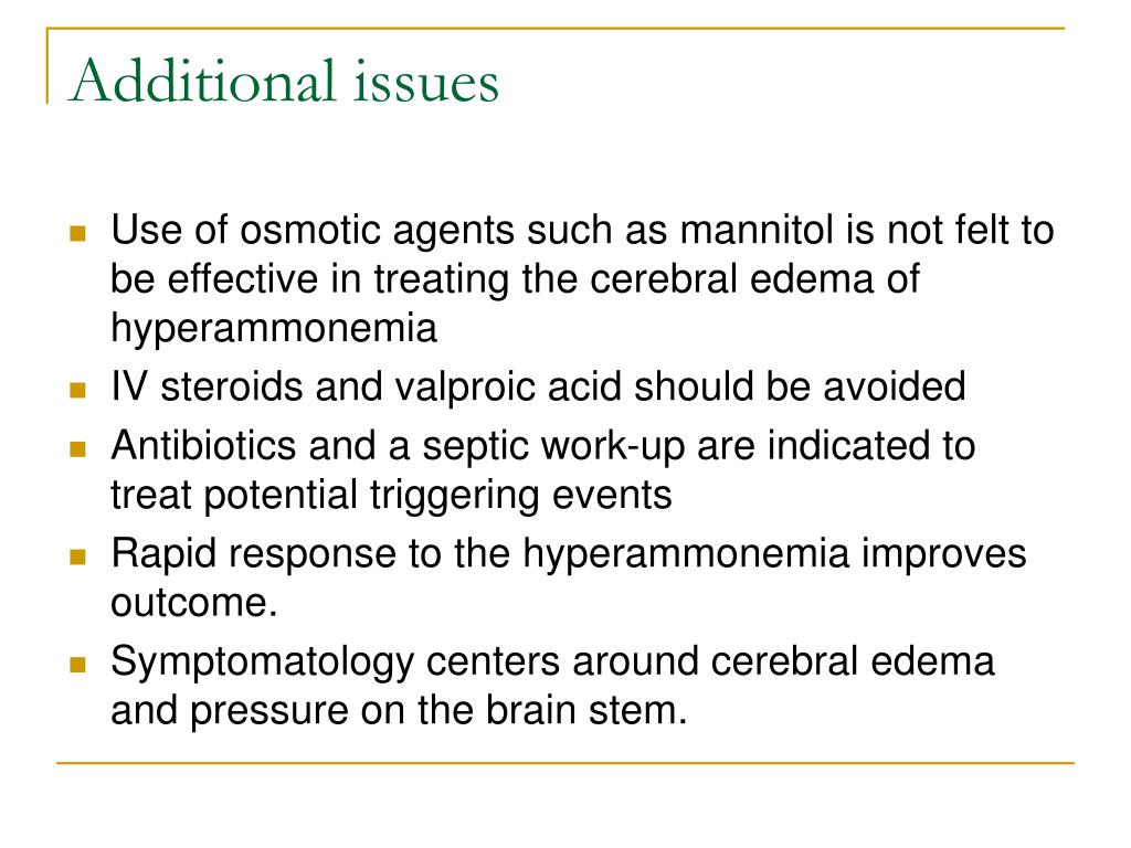 Additional issues • Use of osmotic agents such as mannitol is not felt to be effective in treating the cerebral edema of hyperammonemia • IV steroids and valproic acid should be avoided • Antibiotics and a septic work-up are indicated to treat potential triggering events • Rapid response to the hyperammonemia improves outcome. • Symptomatology centers around cerebral edema and pressure on the brain stem.