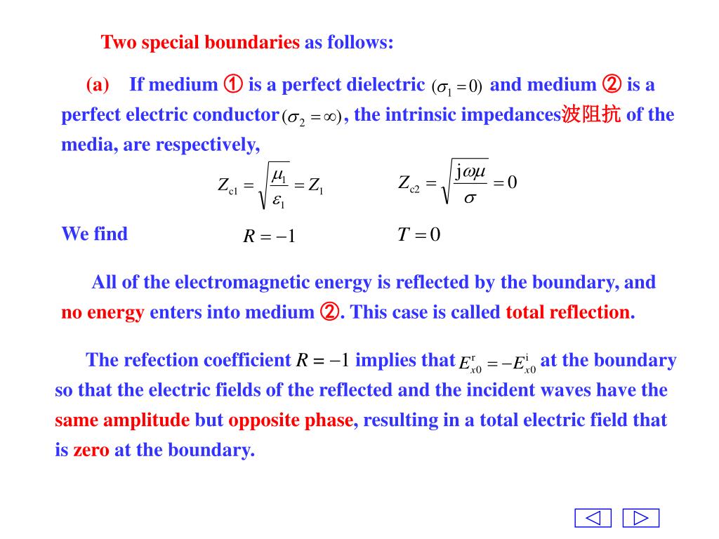(a) If medium ① is a perfect dielectric and medium ② is a perfect electric conductor , the intrinsic impedances波阻抗of the media, are respectively, We find The refection coefficient R = 1 implies that at the boundary so that the electric fields of the reflected and the incident waves have the same amplitude but opposite phase, resulting in a total electric field that is zero at the boundary. Two special boundaries as follows: All of the electromagnetic energy is reflected by the boundary, and no energy enters into medium ②. This case is called total reflection.
