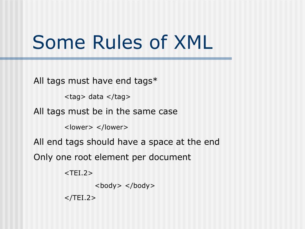 Some Rules of XML All tags must have end tags* <tag> data </tag> All tags must be in the same case <lower> </lower> All end tags should have a space at the end Only one root element per document <TEI.2> <body> </body> </TEI.2>