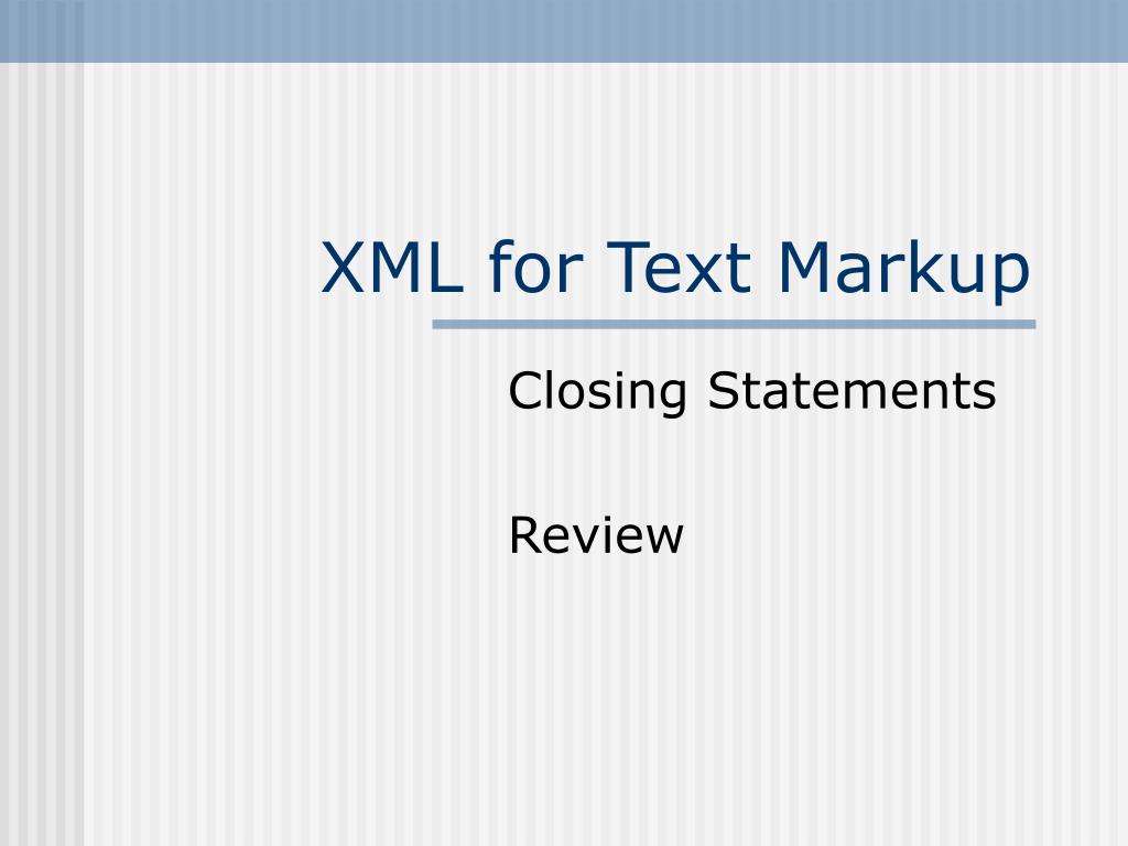 Uses of XML • Storing of metadata • Communication between machines • Markup of text for preservation