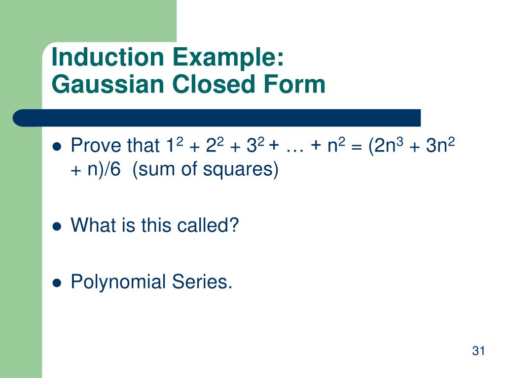 Induction Example: Gaussian Closed Form • Prove that 12 + 22 + 32 + … + n2 = (2n3 + 3n2 + n)/6 (sum of squares) • What is this called? • Polynomial Series.