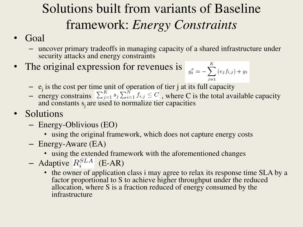 Solutions built from variants of Baseline framework: Energy Constraints • Goal • uncover primary tradeoffs in managing capacity of a shared infrastructure under security attacks and energy constraints • The original expression for revenues is • ej is the cost per time unit of operation of tier j at its full capacity • energy constrains,where C is the total available capacity and constants sjare used to normalize tier capacities • Solutions • Energy-Oblivious (EO) • using the original framework, which does not capture energy costs • Energy-Aware (EA) • using the extended framework with the aforementioned changes • Adaptive (E-AR) • the owner of application class i may agree to relax its response time SLA by a factor proportional to S to achieve higher throughput under the reduced allocation, where S is a fraction reduced of energy consumed by the infrastructure