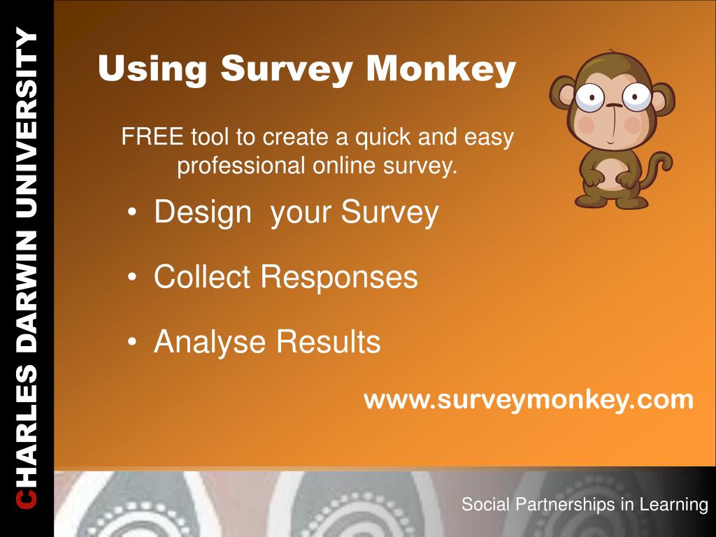 Using Survey Monkey FREE tool to create a quick and easy professional online survey. • Design your Survey • Collect Responses • Analyse Results www.surveymonkey.com