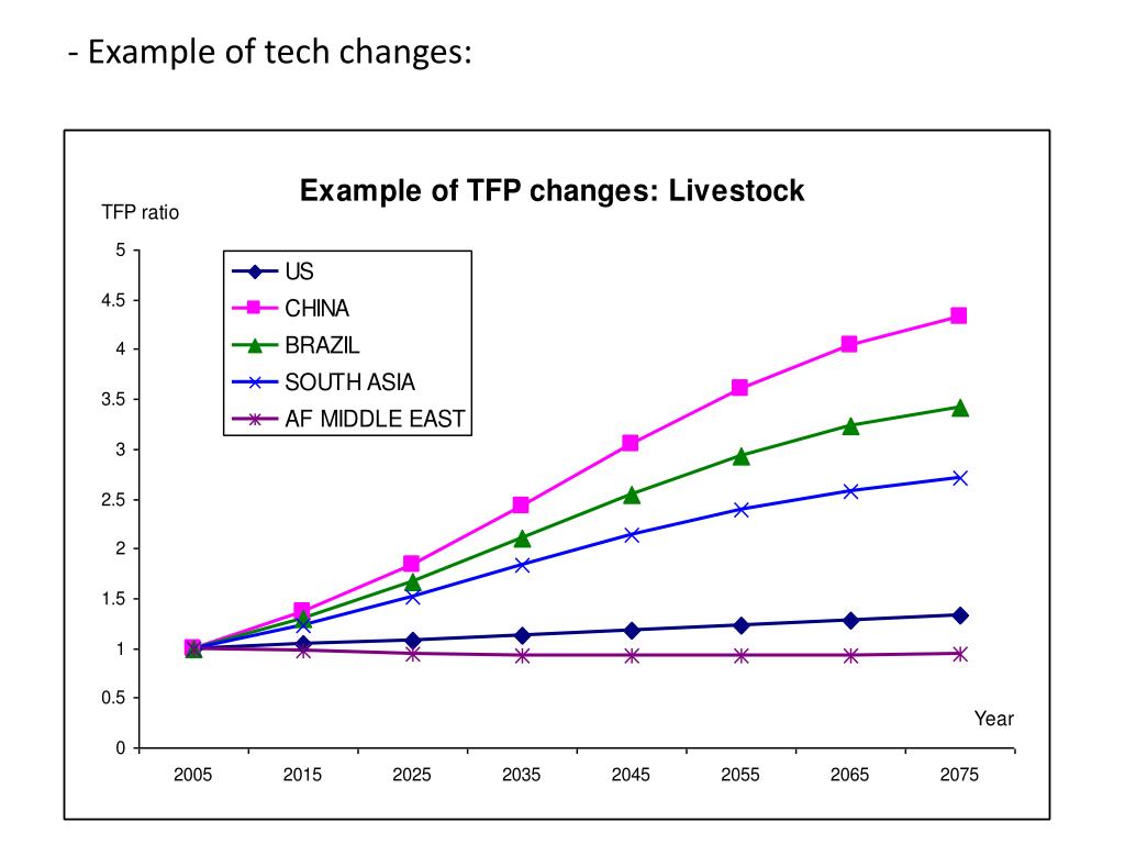 Technology Assumptions: Annual % Change in Total Factor Productivity Forestry sector technology assumed globally at 3% per decade (Sohngen et al) • Source: study with 40 year global data and estimation (Ludena et al, 2006)