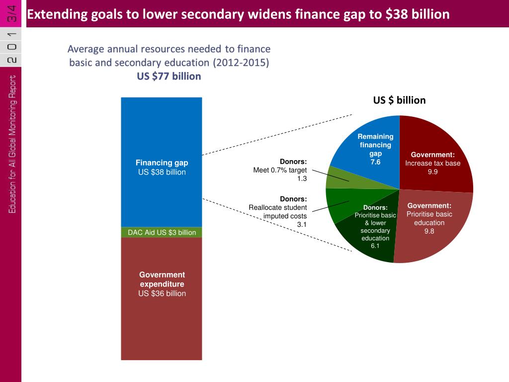 Extending goals to lower secondary widens finance gap to $38 billion Remaining financing gap 7.6 Government: Increase tax base 9.9 Donors: Meet 0.7% target 1.3 Financing gap US $38 billion Donors: Reallocate student imputed costs 3.1 Government: Prioritise basic education 9.8 Donors: Prioritise basic & lower secondary education 6.1
