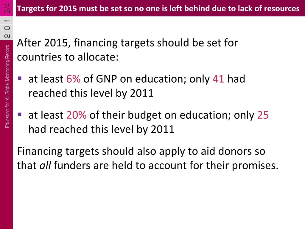 Targets for 2015 must be set so no one is left behind due to lack of resources After 2015, financing targets should be set for countries to allocate: • at least 6% of GNP on education; only 41 had reached this level by 2011 • at least 20% of their budget on education; only 25 had reached this level by 2011 Financing targets should also apply to aid donors so that all funders are held to account for their promises.