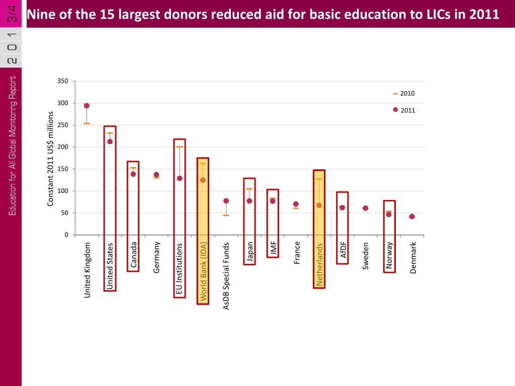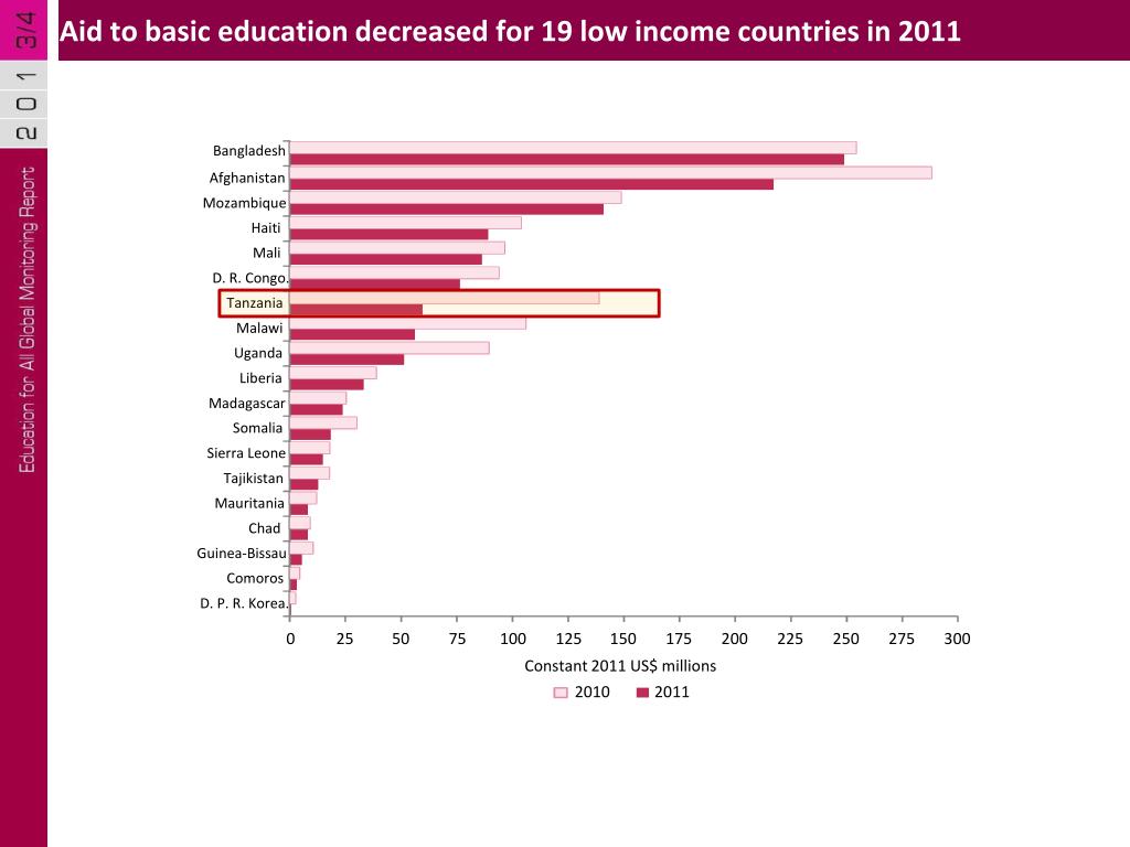 Aid to basic education decreased for 19 low income countries in 2011 Bangladesh Afghanistan Mozambique Haiti Mali D. R. Congo. Tanzania Malawi Uganda Liberia Madagascar Somalia Sierra Leone Tajikistan Mauritania Chad Guinea-Bissau Comoros D. P. R. Korea. 0 25 50 75 100 125 150 175 200 225 250 275 300 Constant 2011 US$ millions 2010 2011