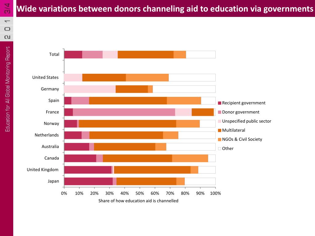 Wide variations between donors channeling aid to education via governments Total United States Germany Spain Recipient government France Donor government Unspecified public sector Norway Multilateral Netherlands NGOs & Civil Society Australia Other Canada United Kingdom Japan 0% 10% 20% 30% 40% 50% 60% 70% 80% 90% 100% Share of how education aid is channelled