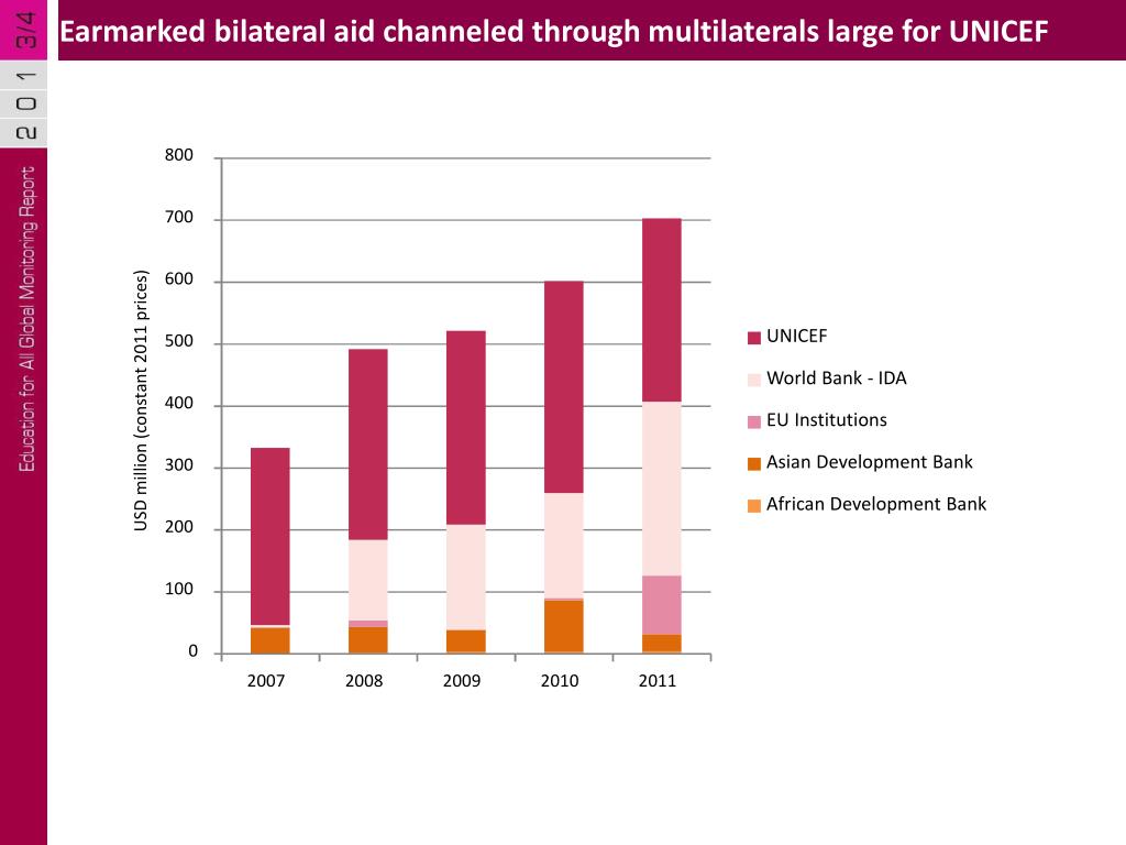 Earmarked bilateral aid channeled through multilaterals large for UNICEF 800 700 600 USD million (constant 2011 prices) UNICEF 500 World Bank - IDA 400 EU Institutions Asian Development Bank 300 African Development Bank 200 100 0 2007 2008 2009 2010 2011