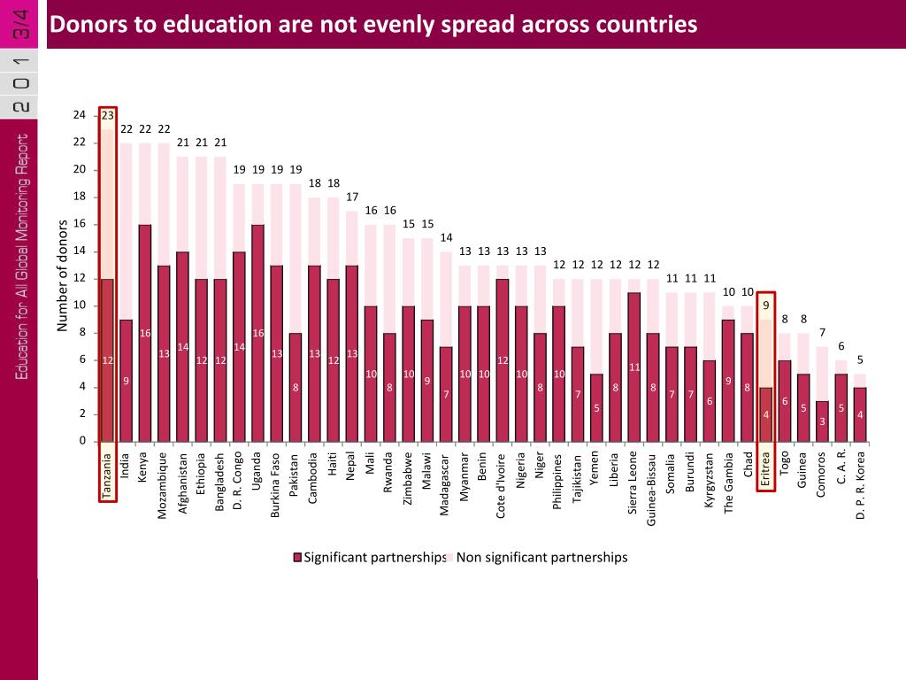 Donors to education are not evenly spread across countries 24 23 22 22 22 22 21 21 21 20 19 19 19 19 18 18 18 17 16 16 16 15 15 14 14 13 13 13 13 13 12 12 12 12 12 12 12 11 11 11 10 10 10 9 8 8 8 7 16 16 6 14 14 13 13 13 13 6 5 12 12 12 12 12 11 10 10 10 10 10 10 9 9 9 4 8 8 8 8 8 8 7 7 7 7 6 6 5 5 5 2 4 4 3 0 India Kenya Uganda Ethiopia Tanzania D. R. Congo Bangladesh Afghanistan Mozambique Number of donors D. P. R. Korea The Gambia Mali Togo Haiti Chad Niger Nepal Benin C. A. R. Yemen Eritrea Liberia Guinea Nigeria Malawi Burundi Rwanda Somalia Pakistan Comoros Myanmar Tajikistan Cambodia Zimbabwe Kyrgyzstan Philippines Sierra Leone Madagascar Burkina Faso Cote d'Ivoire Guinea-Bissau Significant partnerships Non significant partnerships