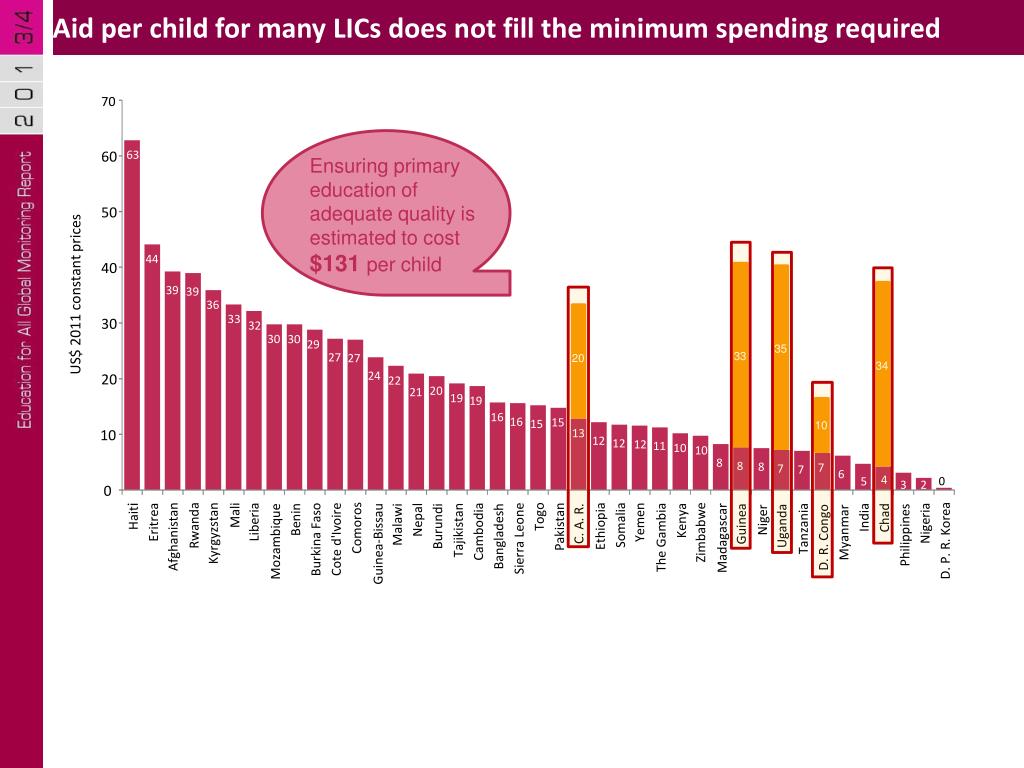 Aid per child for many LICs does not fill the minimum spending required 70 60 63 Ensuring primary education of adequate quality is estimated to cost $131 per child 50 US$ 2011 constant prices 44 40 39 39 36 33 30 32 30 30 29 35 33 27 20 27 34 24 20 22 21 20 19 19 16 16 15 10 15 10 13 12 12 12 11 10 10 8 8 8 7 7 7 6 4 5 3 2 0 0 C. A. R. D. P. R. Korea Comoros Afghanistan Rwanda Kyrgyzstan Nigeria Pakistan Ethiopia Somalia Togo Zimbabwe Yemen Sierra Leone Eritrea Haiti Mali Cambodia Burkina Faso Cote d'Ivoire Liberia The Gambia Tajikistan Kenya Chad Madagascar Tanzania Nepal Benin Guinea-Bissau India Bangladesh Burundi Philippines Mozambique Malawi Guinea Uganda Niger Myanmar D. R. Congo