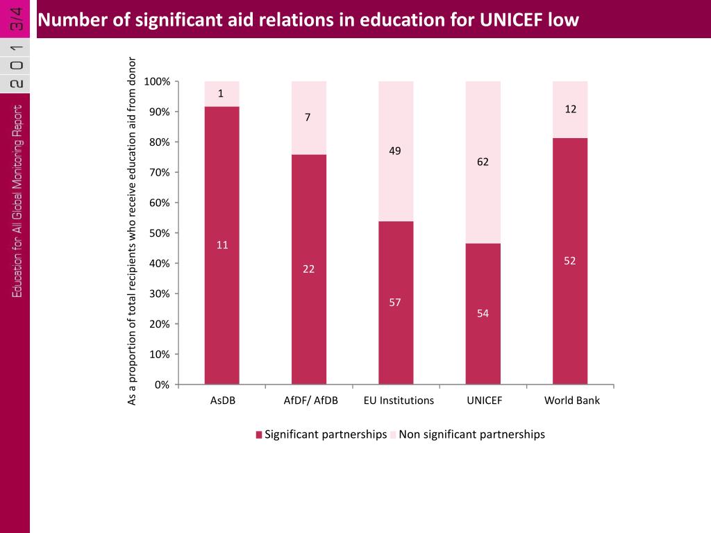Number of significant aid relations in education for UNICEF low 100% 1 12 90% 7 80% 49 62 70% 60% 50% 11 52 40% 22 30% 57 54 20% 10% 0% As a proportion of total recipients who receive education aid from donor AsDB AfDF/ AfDB EU Institutions UNICEF World Bank Significant partnerships Non significant partnerships