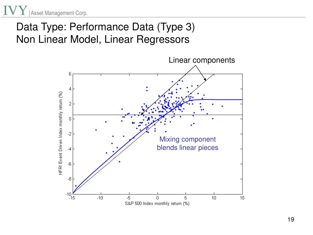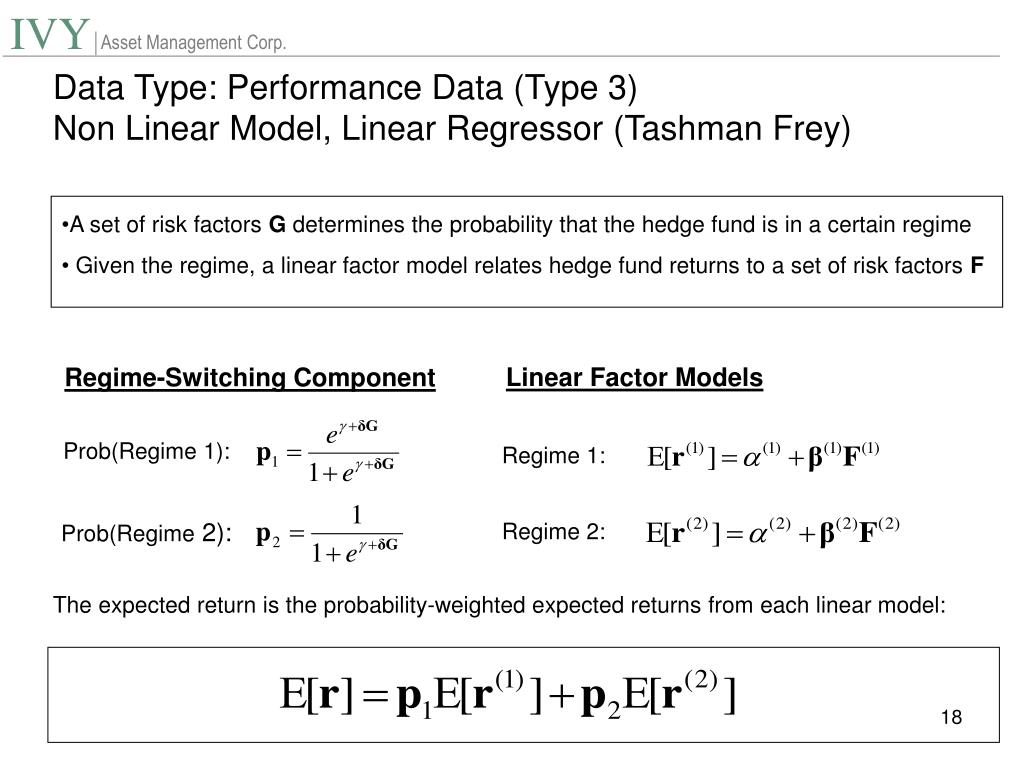 Data Type: Performance Data (Type 3) • Summary of Multi-Factor Models • Linear Model, Linear in Regressors (eg Fama/French) • Linear Model, Non-Linear in Regressors (Naik/Aggerwal) • Non Linear Model, Linear in Regressors (Tashman/Frey) • Non Linear Model, Non Linear in Regressors?