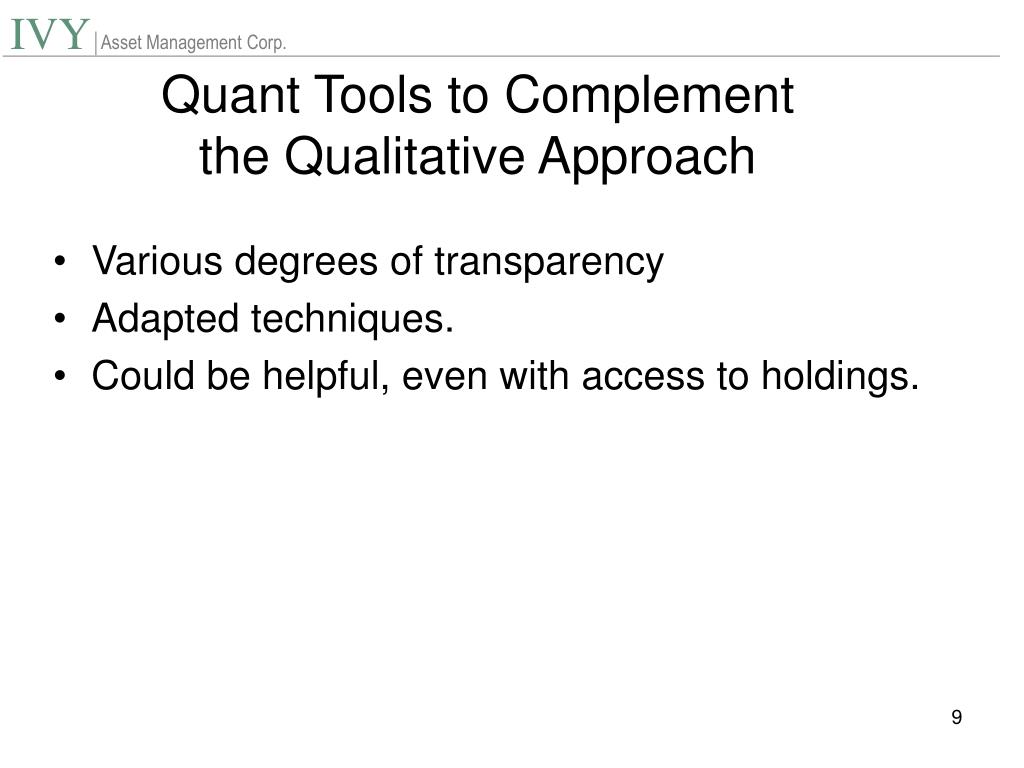 Quant Tools to Complement the Qualitative Approach • Various degrees of transparency • Adapted techniques. • Could be helpful, even with access to holdings.