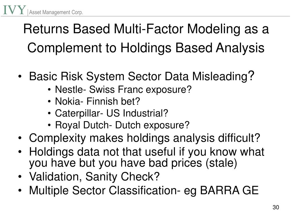 Returns Based Multi-Factor Modeling as a Complement to Holdings Based Analysis • Basic Risk System Sector Data Misleading? • Nestle- Swiss Franc exposure? • Nokia- Finnish bet? • Caterpillar- US Industrial? • Royal Dutch- Dutch exposure? • Complexity makes holdings analysis difficult? • Holdings data not that useful if you know what you have but you have bad prices (stale) • Validation, Sanity Check? • Multiple Sector Classification- eg BARRA GE