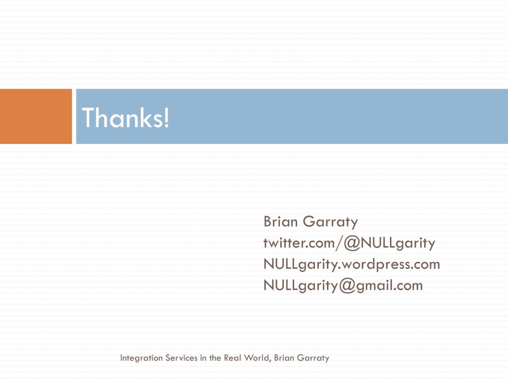 Thanks! Brian Garraty twitter.com/@NULLgarity NULLgarity.wordpress.com NULLgarity@gmail.com Integration Services in the Real World, Brian Garraty