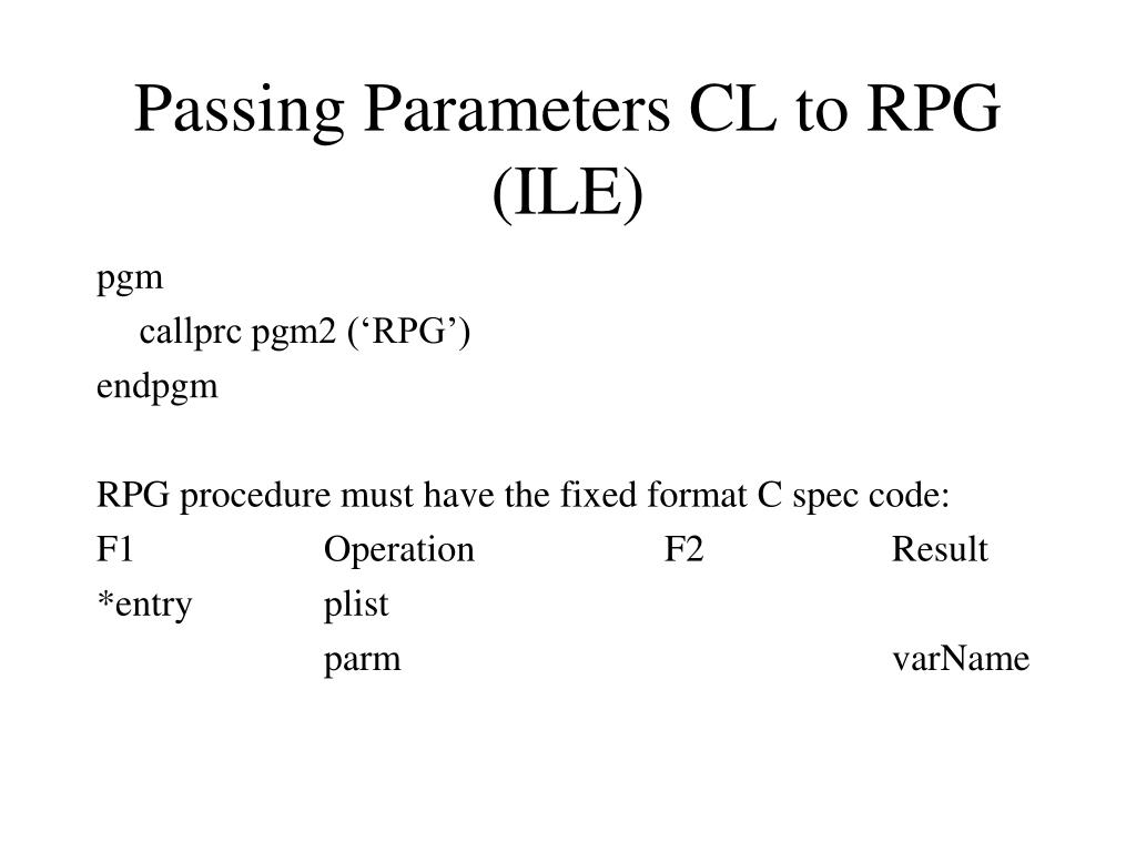 Passing Parameters CL to RPG (OPM) pgm call pgm2 (‘RPG’) endpgm RPG program must have the fixed format C spec code: F1 Operation F2 Result *entry plist parm varName