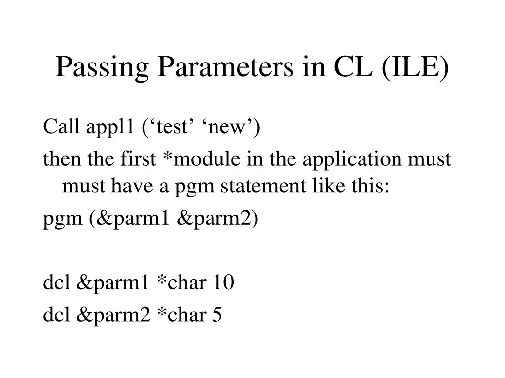 Passing Parameters in CL (ILE) Call appl1 (‘test’ ‘new’) then the first *module in the application must must have a pgm statement like this: pgm (&parm1 &parm2) dcl &parm1 *char 10 dcl &parm2 *char 5