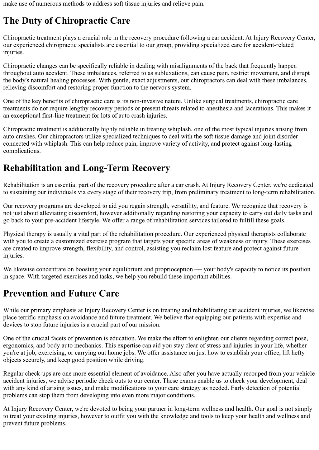 make use of numerous methods to address soft tissue injuries and relieve pain. The Duty of Chiropractic Care Chiropractic treatment plays a crucial role in the recovery procedure following a car accident. At Injury Recovery Center, our experienced chiropractic specialists are essential to our group, providing specialized care for accident-related injuries. Chiropractic changes can be specifically reliable in dealing with misalignments of the back that frequently happen throughout auto accident. These imbalances, referred to as subluxations, can cause pain, restrict movement, and disrupt the body's natural healing processes. With gentle, exact adjustments, our chiropractors can deal with these imbalances, relieving discomfort and restoring proper function to the nervous system. One of the key benefits of chiropractic care is its non-invasive nature. Unlike surgical treatments, chiropractic care treatments do not require lengthy recovery periods or present threats related to anesthesia and lacerations. This makes it an exceptional first-line treatment for lots of auto crash injuries. Chiropractic treatment is additionally highly reliable in treating whiplash, one of the most typical injuries arising from auto crashes. Our chiropractors utilize specialized techniques to deal with the soft tissue damage and joint disorder connected with whiplash. This can help reduce pain, improve variety of activity, and protect against long-lasting complications. Rehabilitation and Long-Term Recovery Rehabilitation is an essential part of the recovery procedure after a car crash. At Injury Recovery Center, we're dedicated to sustaining our individuals via every stage of their recovery trip, from preliminary treatment to long-term rehabilitation. Our recovery programs are developed to aid you regain strength, versatility, and feature. We recognize that recovery is not just about alleviating discomfort, however additionally regarding restoring your capacity to carry out daily tasks and go back to your pre-accident lifestyle. We offer a range of rehabilitation services tailored to fulfill these goals. Physical therapy is usually a vital part of the rehabilitation procedure. Our experienced physical therapists collaborate with you to create a customized exercise program that targets your specific areas of weakness or injury. These exercises are created to improve strength, flexibility, and control, assisting you reclaim lost feature and protect against future injuries. We likewise concentrate on boosting your equilibrium and proprioception –-- your body's capacity to notice its position in space. With targeted exercises and tasks, we help you rebuild these important abilities. Prevention and Future Care While our primary emphasis at Injury Recovery Center is on treating and rehabilitating car accident injuries, we likewise place terrific emphasis on avoidance and future treatment. We believe that equipping our patients with expertise and devices to stop future injuries is a crucial part of our mission. One of the crucial facets of prevention is education. We make the effort to enlighten our clients regarding correct pose, ergonomics, and body auto mechanics. This expertise can aid you stay clear of stress and injuries in your life, whether you're at job, exercising, or carrying out home jobs. We offer assistance on just how to establish your office, lift hefty objects securely, and keep good position while driving. Regular check-ups are one more essential element of avoidance. Also after you have actually recouped from your vehicle accident injuries, we advise periodic check outs to our center. These exams enable us to check your development, deal with any kind of arising issues, and make modifications to your care strategy as needed. Early detection of potential problems can stop them from developing into even more major conditions. At Injury Recovery Center, we're devoted to being your partner in long-term wellness and health. Our goal is not simply to treat your existing injuries, however to outfit you with the knowledge and tools to keep your health and wellness and prevent future problems.