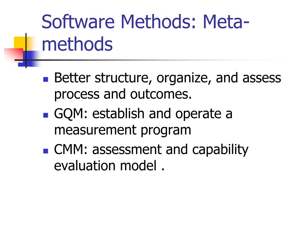 Software Methods: Meta-methods • Better structure, organize, and assess process and outcomes. • GQM: establish and operate a measurement program • CMM: assessment and capability evaluation model .