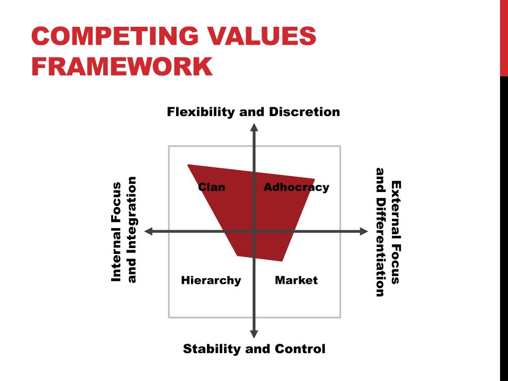 Competing Values Framework Flexibility and Discretion Clan Adhocracy Internal Focus and Integration External Focus and Differentiation Hierarchy Market Stability and Control