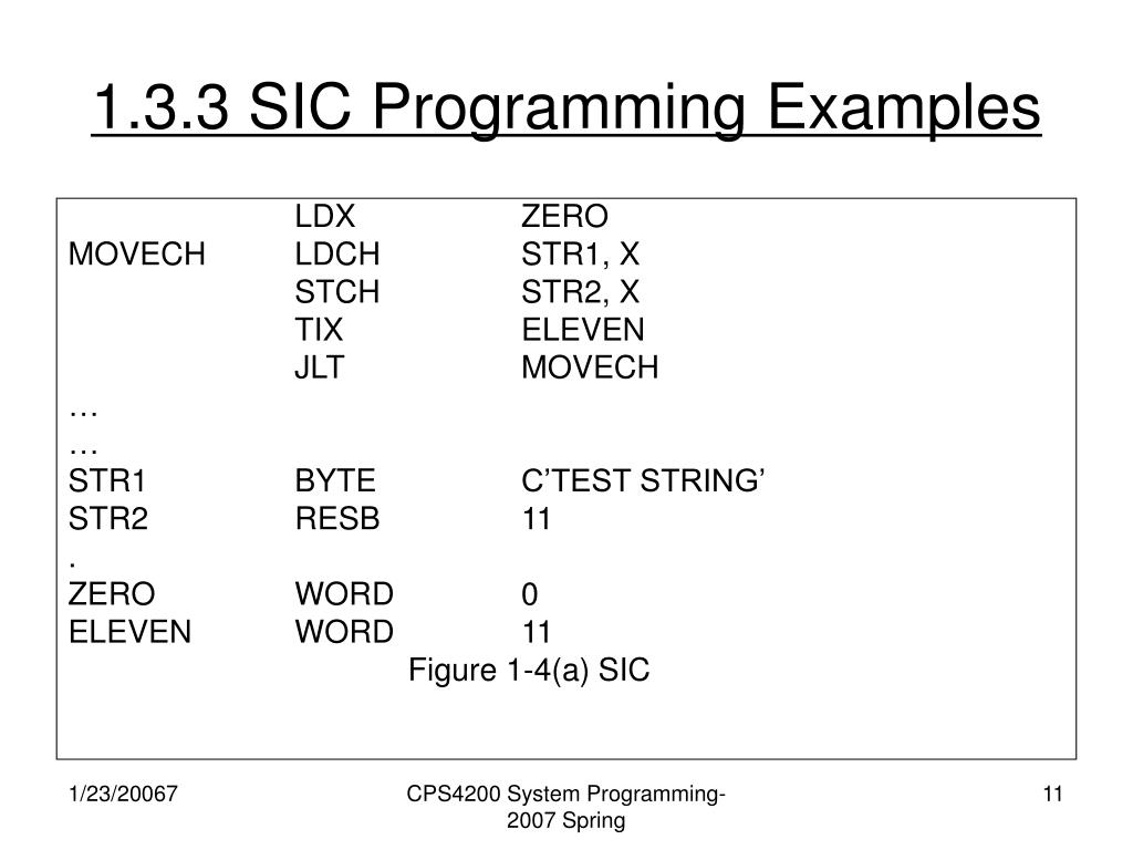 Systems Programming. Chapter 1 Background III. 1.3.3 SIC Programming Examples. In Figure 1.2(a), 3-byte word is moved by loading it into register A and then storing the register at the desired destination. RESW reserves one or more words of storage