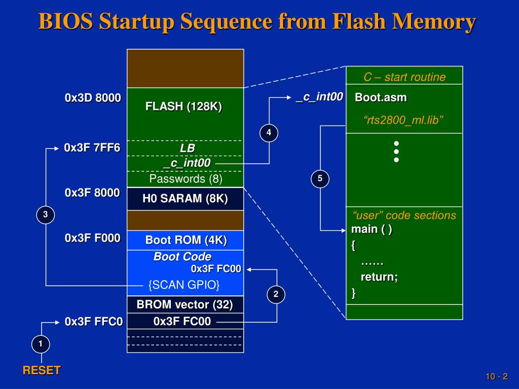 Module 10 : Flash Programming C28x. 32-Bit-Digital Signal Controller TMS320F2812. Texas Instruments Incorporated European Customer Training Centre University of Applied Sciences Zwickau (FH). BIOS Startup Sequence from Flash Memory. C – start routine. _c_int00. 0x3D 8000. Boot.asm.