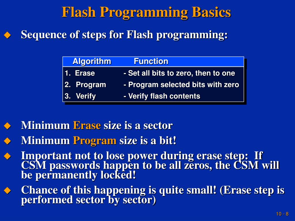 Flash Programming Basics Sequence of steps for Flash programming: Minimum Erase size is a sector Minimum Program size is a bit! Important not to lose power during erase step: If CSM passwords happen to be all zeros, the CSM will be permanently locked! Chance of this happening is quite small! (Erase step is performed sector by sector) Algorithm Function • 1. Erase - Set all bits to zero, then to one • Program - Program selected bits with zero • Verify - Verify flash contents