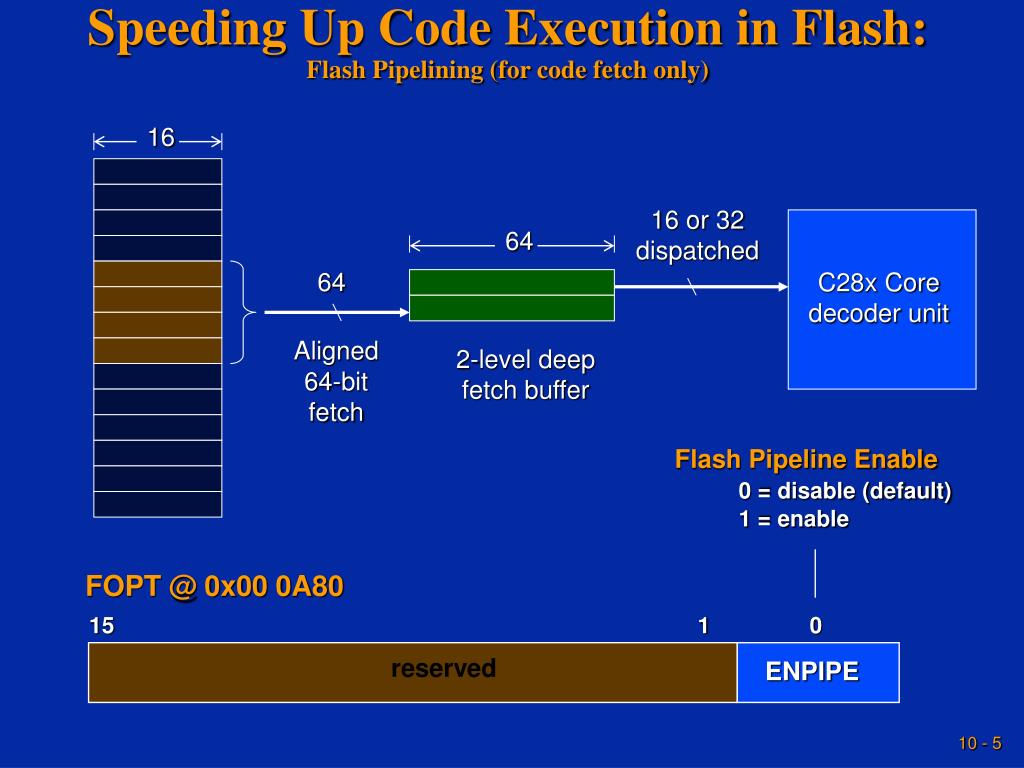 Speeding Up Code Execution in Flash:Flash Pipelining (for code fetch only) 16 16 or 32 dispatched 64 64 C28x Core decoder unit Aligned 64-bit fetch 2-level deep fetch buffer Flash Pipeline Enable 0 = disable (default) 1 = enable FOPT @ 0x00 0A80 15 1 0 reserved ENPIPE