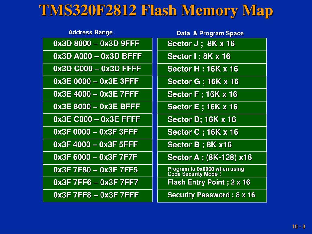TMS320F2812 Flash Memory Map Address Range Flash Entry Point ; 2 x 16 0x3D 8000 – 0x3D 9FFF 0x3D A000 – 0x3D BFFF 0x3D C000 – 0x3D FFFF 0x3E 0000 – 0x3E 3FFF 0x3E 4000 – 0x3E 7FFF 0x3E 8000 – 0x3E BFFF 0x3E C000 – 0x3E FFFF 0x3F 0000 – 0x3F 3FFF 0x3F 4000 – 0x3F 5FFF 0x3F 6000 – 0x3F 7F7F 0x3F 7F80 – 0x3F 7FF5 0x3F 7FF6 – 0x3F 7FF7 0x3F 7FF8 – 0x3F 7FFF Sector J ; 8K x 16 Sector I ; 8K x 16 Sector H : 16K x 16 Sector G ; 16K x 16 Sector F ; 16K x 16 Sector E ; 16K x 16 Sector D; 16K x 16 Sector C ; 16K x 16 Sector B ; 8K x16 Sector A ; (8K-128) x16 Program to 0x0000 when using Code Security Mode ! Data & Program Space Security Password ; 8 x 16